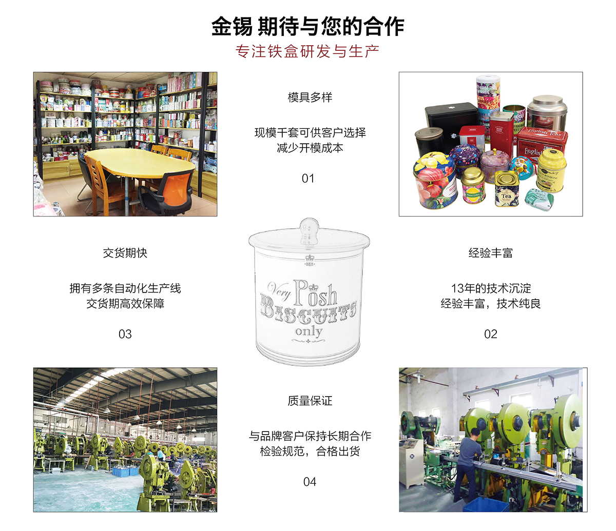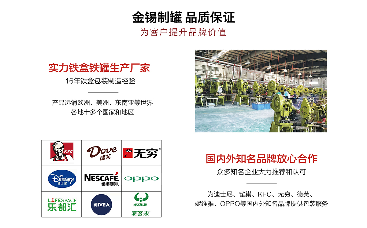 廣州市金錫五金制品有限公司成立于2016年,是已有13年生產(chǎn)經(jīng)驗(yàn)的實(shí)力廠家。我廠是專業(yè)定制優(yōu)良馬口鐵盒、鐵罐、禮品盒、茶葉罐、月餅盒等金屬鐵盒包裝的制罐企業(yè),我們擁有超過6000平方米的標(biāo)準(zhǔn)現(xiàn)代化廠房及八條生產(chǎn)線。公司集產(chǎn)品研發(fā)、設(shè)計(jì)、生產(chǎn)、銷售于一體,技術(shù)優(yōu)良,實(shí)力雄厚。通過十多年的制罐經(jīng)驗(yàn),我們擁有專業(yè)的技術(shù)團(tuán)隊(duì),嚴(yán)格的作業(yè)流程、完整的品質(zhì)保障體系、完善的銷售以及售后服務(wù)系統(tǒng)。
